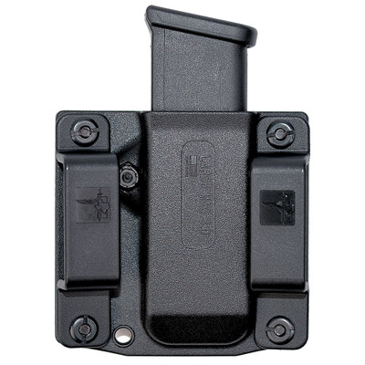 "This pouch is constructed from .080 KYDEX, which offers durability and longevity while maintaining a thin, low profile form. This pouch features a fully ambidextrous design which allows easy conversion for all desired carry positions. The proprietary clip is made of a high strength polymer which can be utilized on a variety of clothing styles. Ride height and tilt of the pouch can be easily adjusted by simply adjusting the positioning of the clip on the pouch. The COVERT series mag pouch also features user adjustable retention so the user can adjust the pouch to their preferences."