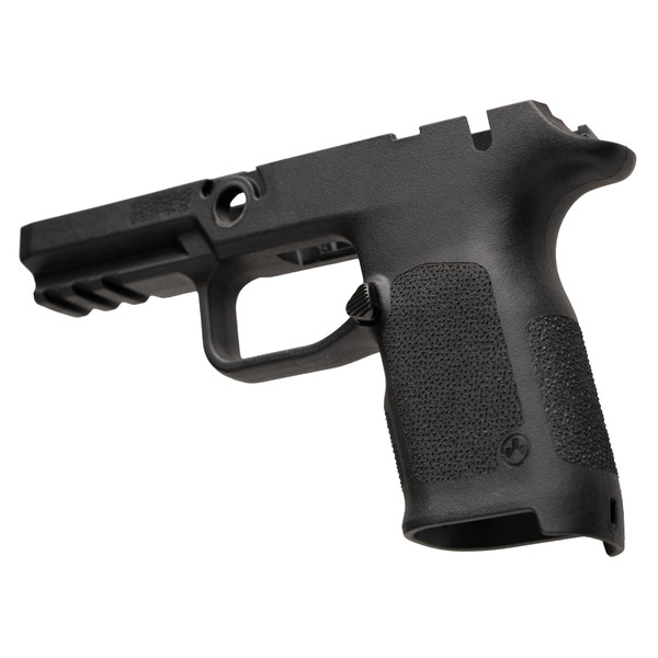 "The Magpul EHG SG9 Compact grip frame for the SIG Sauer P320 functions with OEM P320 trigger modules, OEM 15-round magazines and magazine base plates, and small components and accessories. The EHG SG9 features an integral carry-sized magazine well flare and includes a Picatinny rail for lights or lasers. As an added bonus, the frame also comes with the Magpul-designed Magazine Release installed, which is reversible for left-handed shooters. This steel magazine release is finished in QPQ to resist corrosion and wear, and the release's contoured surface features custom jimping to ensure positive engagement with the shooter's finger when changing magazines."