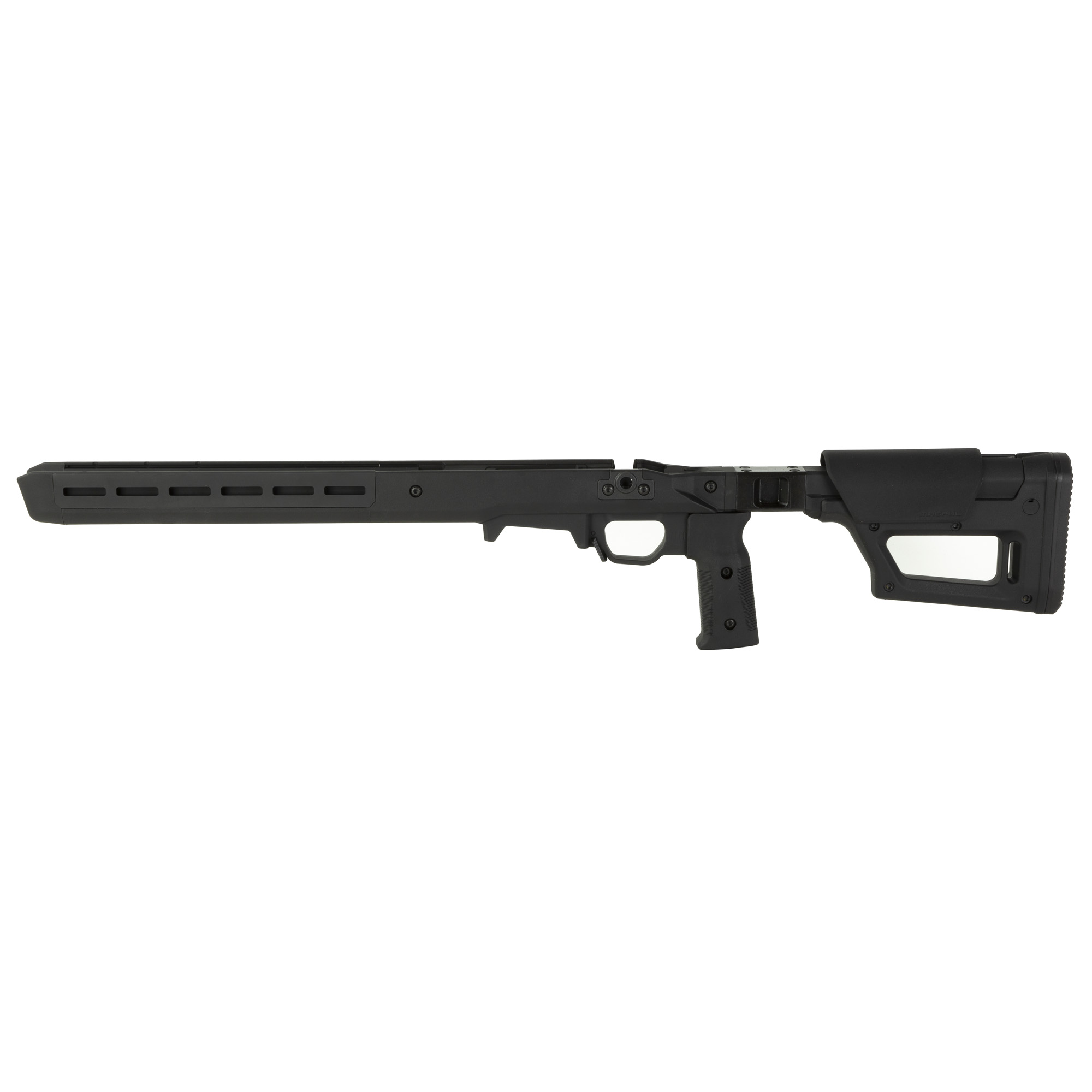 "The Pro 700 Lite surrounds it's billet aluminum chassis with Magpul polymer for enhanced ergonomics, strength, and sound mitigation. Built around the user, it is fully ambidextrous at the swap of a bolt retainer plate, and the vertical grip can be adjusted for various trigger reaches. The included large trigger guard can accommodate usage with gloves and aftermarket triggers. The AICS-pattern magazine well features an ambidextrous mag release and has a front barricade stop to prevent the rifle from resting on the magazine when using barricade support. Up front, there are numerous M-LOK slots (left-6/right-6/bottom-7) allowing you to mount whatever accessories your loadout calls for. As the name suggests, the Pro 700 Lite blends the original Pro 700 Chassis and the PRS Lite stock to create a simplified rear end with a strong foundation - passing on the value and weight savings to you. The streamlined design weighs in at 4.4 pounds, a full pound less than its predecessor, but still packs a complete set of features that elevate your rifle's performance."